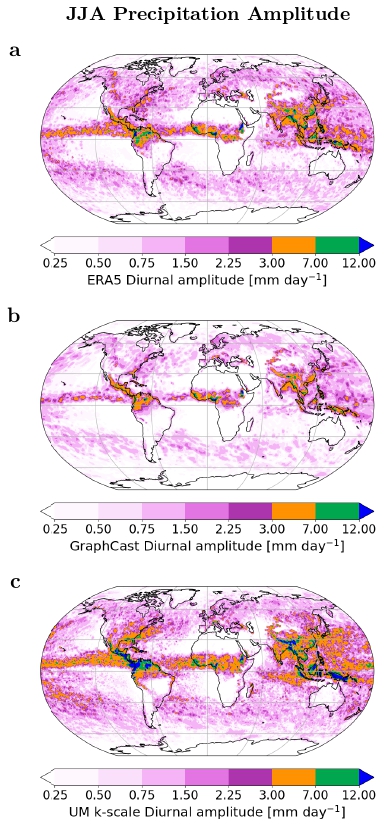 This stability confirms that the seasonal mismatch between datasets (IMERG and the UM 5-km simulation in 2021 versus ERA5 and GraphCast in 2023) does not compromise the intercomparison. The diurnal cycle provides a robust, physically interpretable benchmark against which different modelling approaches can be evaluated.