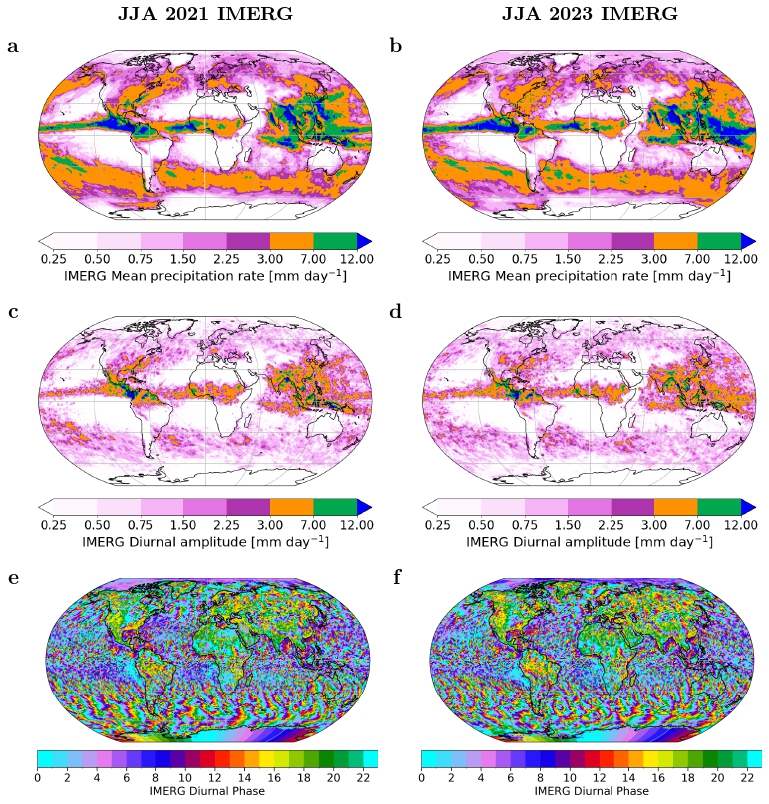 Mean precipitation patterns differ only modestly between the two seasons, with 2023 slightly wetter over parts of the tropical oceans. More importantly, the structure of the diurnal cycle itself — amplitude and timing — is nearly unchanged. Strong diurnal amplitudes persist over continental interiors and coastal regions, while precipitation peaks consistently occur in the late afternoon to early evening over land and during the early morning over tropical oceans.