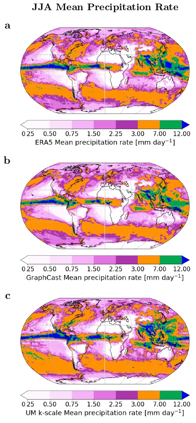 At first glance, all three models — ERA5, GraphCast, and the 5-km Unified Model — reproduce the broad spatial structure of observed mean precipitation. Tropical rainfall maxima along the ITCZ and over the Maritime Continent are evident, as are secondary maxima over regions such as the Great Plains, central Africa, and the Southern Ocean.