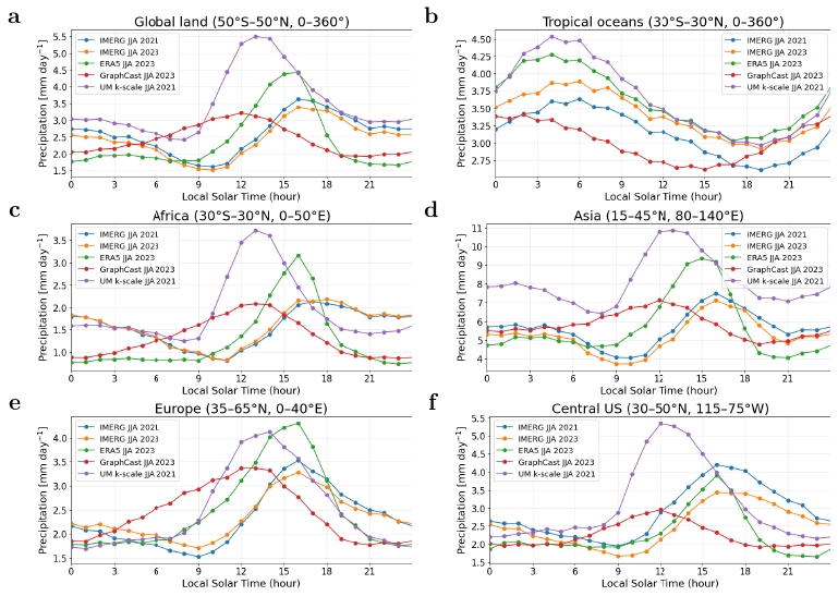 Historically, even state-of-the-art weather and global climate models have struggled with this diagnostic. Rainfall over land tends to begin too early in the day, peak prematurely in the afternoon, and decay too rapidly overnight. Nocturnal precipitation, a defining feature of many continental and monsoon regions, is often weak or entirely absent. Yet these same models can perform well on bulk metrics such as monthly means or spatial correlations, creating a misleading impression of skill.
