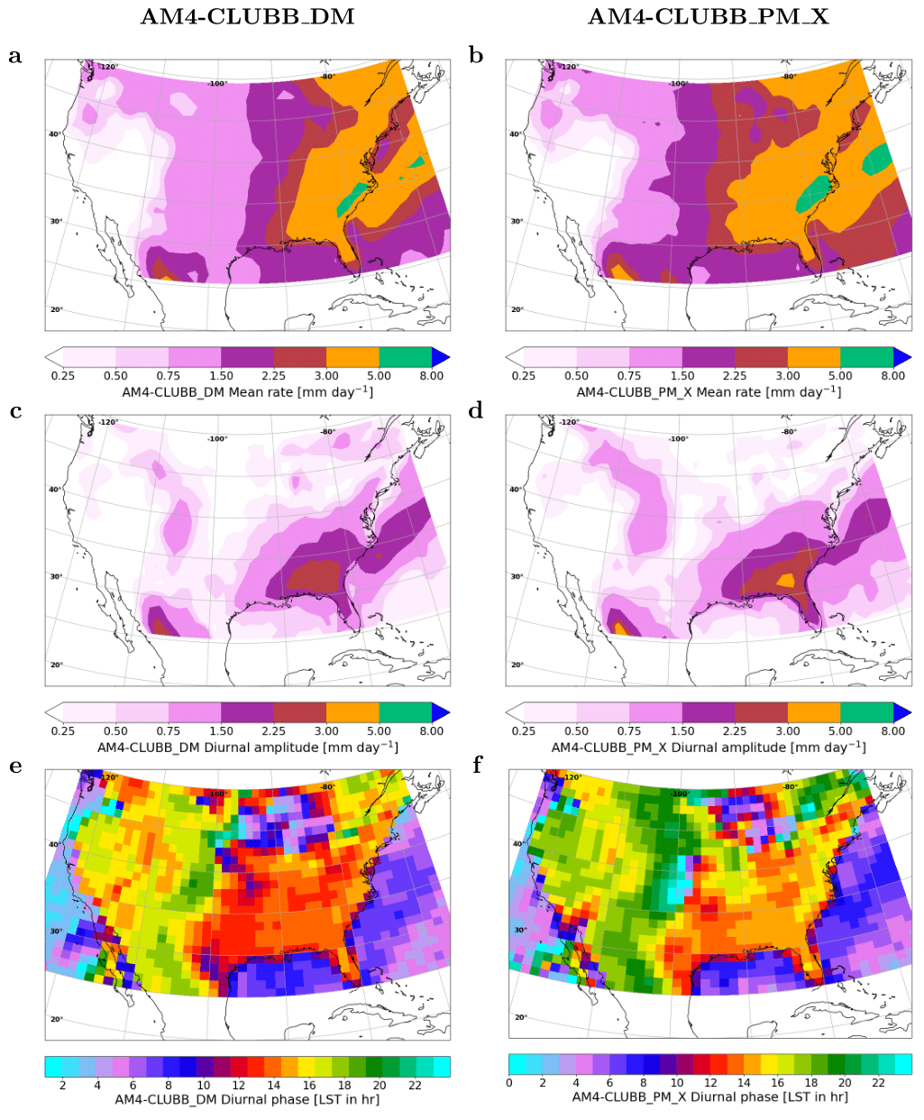 Introducing the multiscale turbulent length scale in combination with prognostic momentum fluxes (AM4-CLUBB_PM_X) yields further benefits (Fig. 2b,d,f). Mean nocturnal precipitation over the central Great Plains approaches satellite-derived values, with the bias reduced to less than –1 mm/day (compared with –3 mm/day in the control simulation). The hourly distribution also exhibits a clear nocturnal maximum and a more pronounced afternoon minimum, indicating a more realistic coupling between the stable PBL and nocturnal convection.