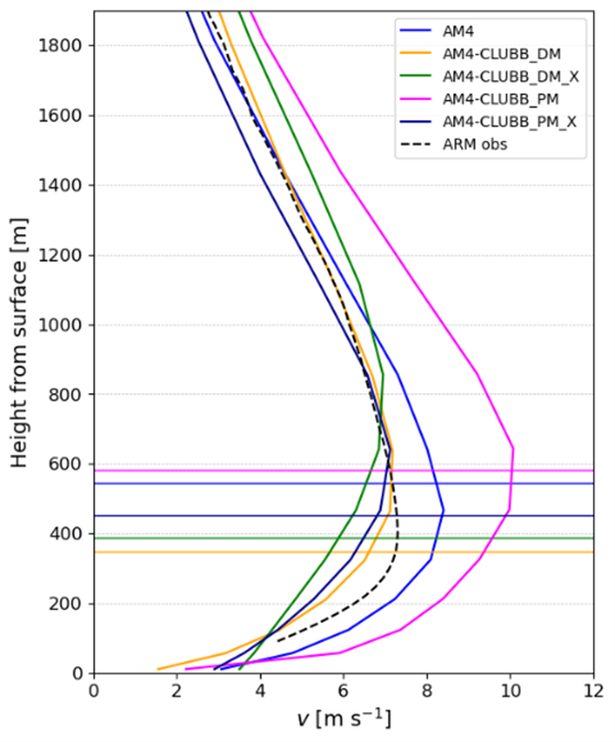 Prognostic momentum flux treatment In traditional models, vertical momentum fluxes (the turbulent exchange of momentum) are handled in a simplified way using a diagnostic momentum flux (AM4-CLUBB_DM configuration in this study), which corresponds to a “diffusive” gradient-based approach. This method cannot reproduce counter-gradient fluxes that emerge in nocturnal Low-Level Jets, where air masses can propagate above the jet core. With the prognostic momentum flux (AM4-CLUBB_PM configuration), the fluxes evolve dynamically, making it possible to capture such effects (Larson et al., 2019).
